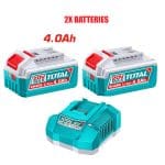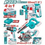 I don't know my zip codeTotal Cordless 4pcs Combo Kit – Impact Drill 66Nm, Rotary Hammer, Air Blower, Circular Saw, with 2x 4.0 Ah Battery, Fast Charger TOSLI250695